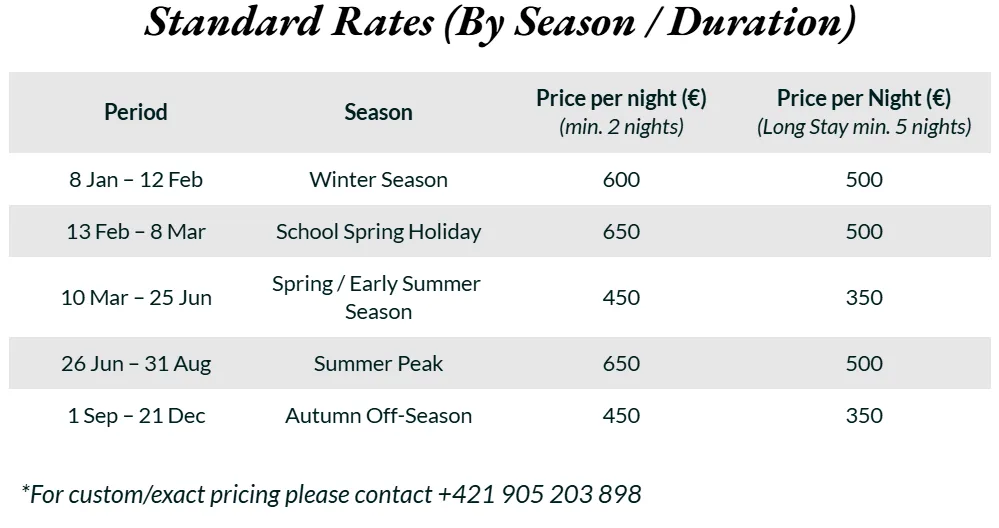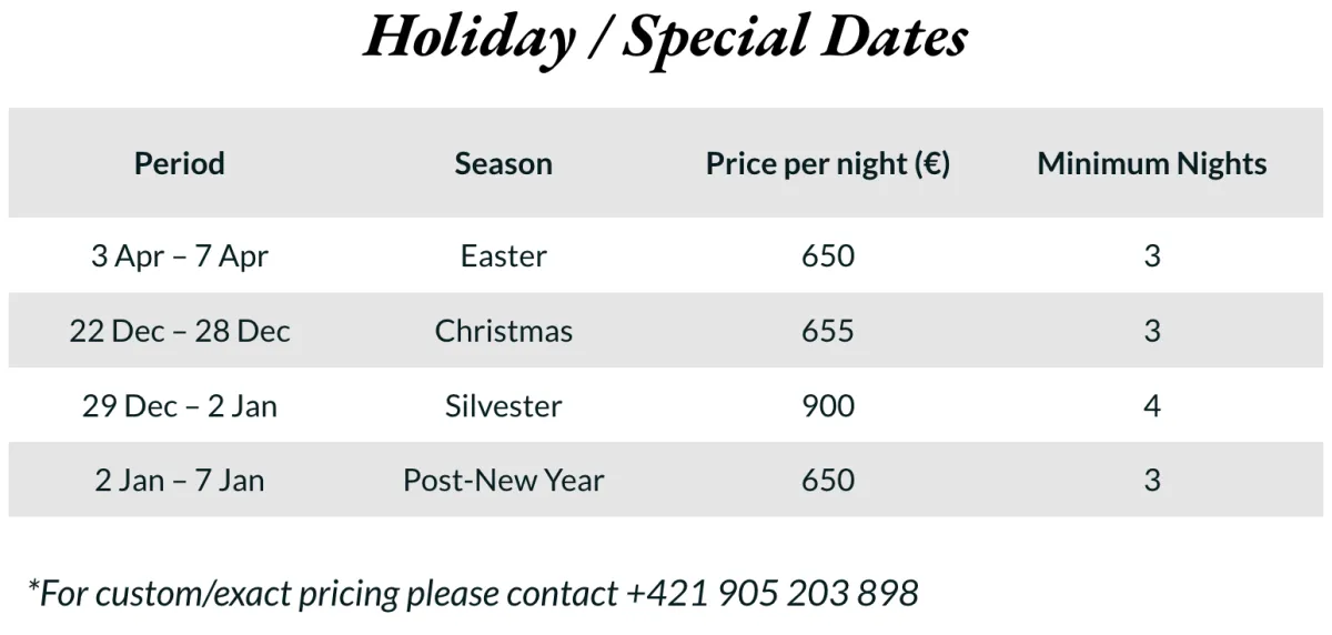 • The local tax payable to the municipality of Hronec is €0.50 per person per night and is charged separately.